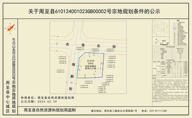 610124001023GB00002号宗地位于西安市周至县行政管辖区内,农商东街以南,南新街以东。规划总用地面积2782.67平方米(4.174亩),其中净用地面积为2561.65平方米(3.842亩),代征道路221.02平方米(0.332亩),规划净用地性质为二类城镇住宅用地(070102),容积率≤2.6,建筑密度≤20.0%,绿地率≥35.0%,建筑限高54米。地下人防建筑面积最终以相关部门的审批为准,建筑退让距离按《西安市城乡规划管理技术规定》执行。城市设计要求、交通组织规划要求、配套设施规划要求等按照相关方面的法规规范执行。规划机动车停车位及非机动车停车位按照《西安市建设项目停车位配建标准的通知》(市资源发〔2023〕3号)执行,机动车、非机动车停车位个数及面积以最终建筑工程审批内容为准。项目实施中须严格符合国家、省、市关于电梯配备、建筑间距、日照、消防、环保等相关方面的法规规范和标准。建设项目需满足海绵城市建设要求。