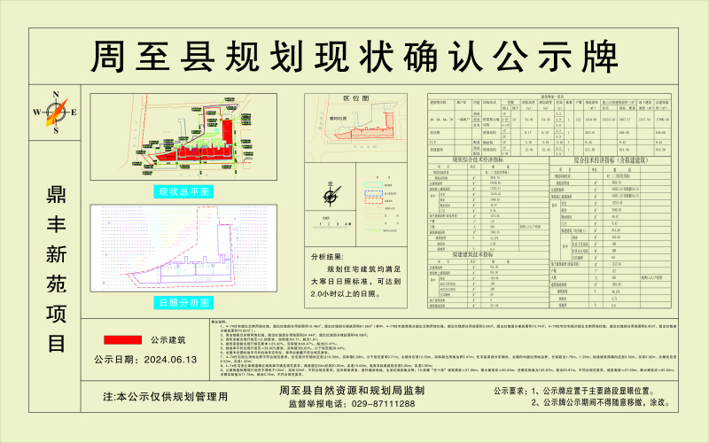 鼎丰新苑项目位于周至县中心东街与万寿路十字东北角,建设单位为陕西鼎丰源置业有限公司。按照周至县处理房屋办证遗留问题领导小组办公室要求,现将规划现状确认内容公示如下: