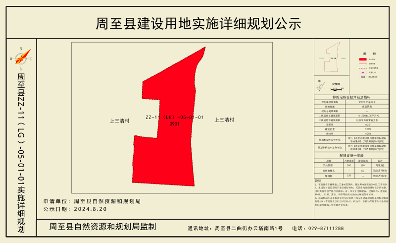 该项目位于周至县楼观镇上三清村范围内,规划用地性质为商业用地,规划用地面积约90022.03平方米,容积率≤2.0,建筑密度≤50%,绿地率≥25%。停车位配建按照《西安市建设项目停车位配建标准的通知》(市资源发〔2023〕3号)执行。