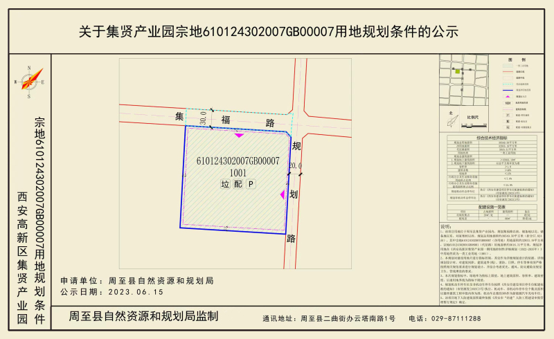 该宗地用地位于周至县集贤产业园内,规划集福路以南、储备地北、储备地以东、刘家堡村以西。规划总用地面积约38549.50平方米(折合57.824亩),其中宗地610124302007GB00007(净用地)用地面积约32933.19平方米,宗地610124302001GB08001(代征路)用地面积约5616.31平方米,规划指标具体如下:地上总建筑面积≥32933.19㎡;容积率≥1.0;建筑系数≥40%;绿地率≤15%;行政办公及生活服务设施用地所占比例≤7.0%,行政办公及生活服务设施建筑面积所占比例≤15.0%。规划机动车停车位及非机动车停车位按照《西安市建设项目停车位配建标准的通知》(市资源发〔2023〕3号)执行,机动车、非机动车停车位个数及面积以最终建筑工程审批内容为准,机动车总量的30%作为新能源汽车充电车位。