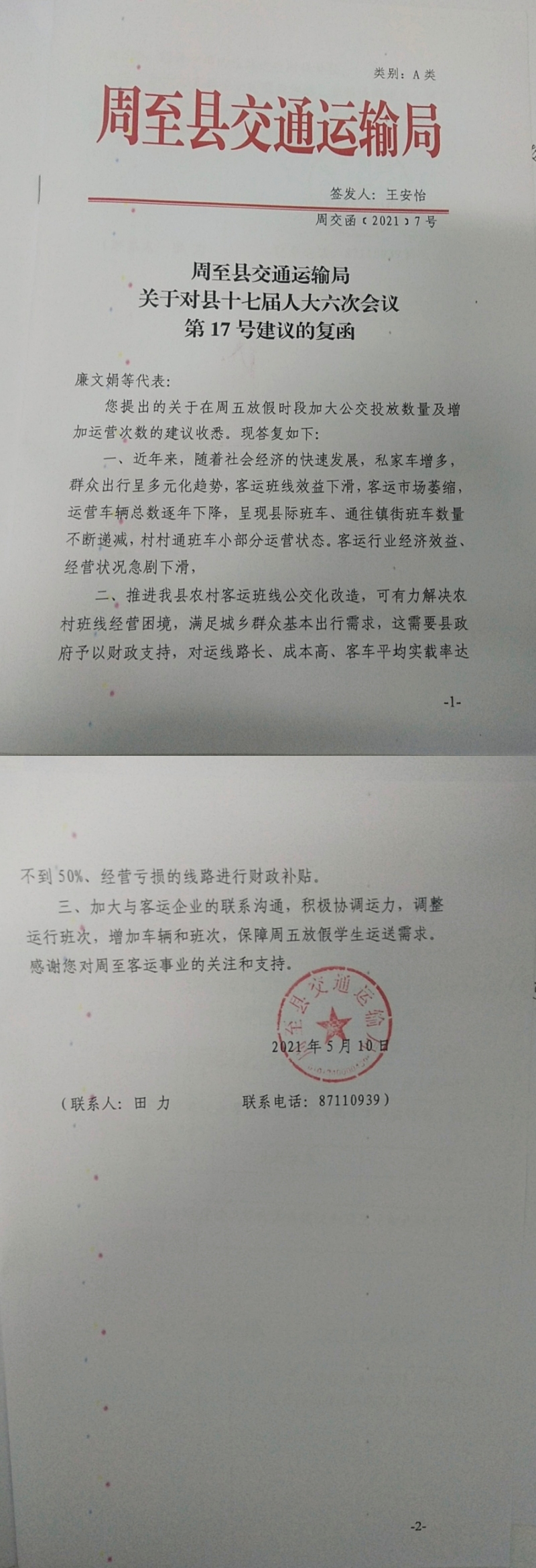 周至县交通运输局关于对县十七届人大六次会议第17号建议的复函