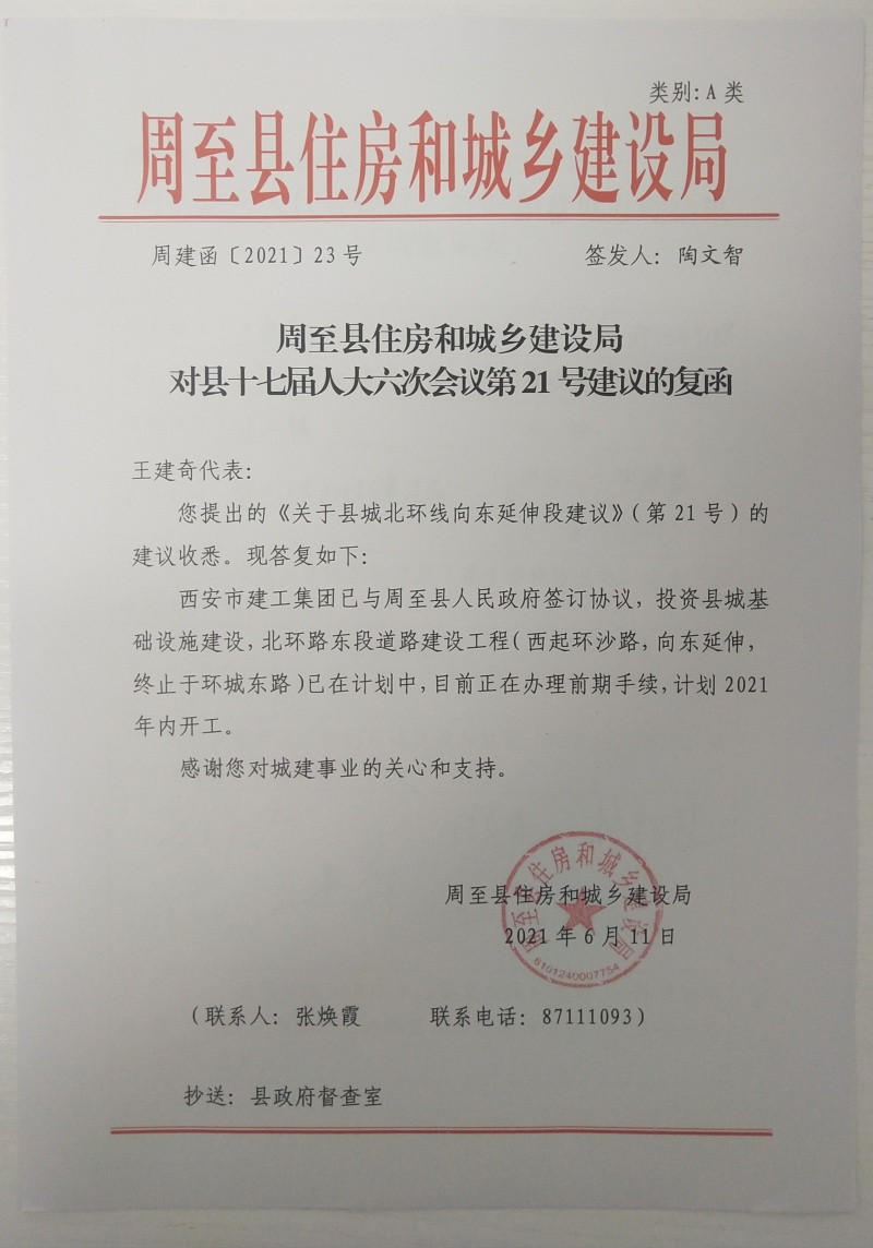 周至县住房和城乡建设局关于对县十七届人大六次会议第21号建议的复函