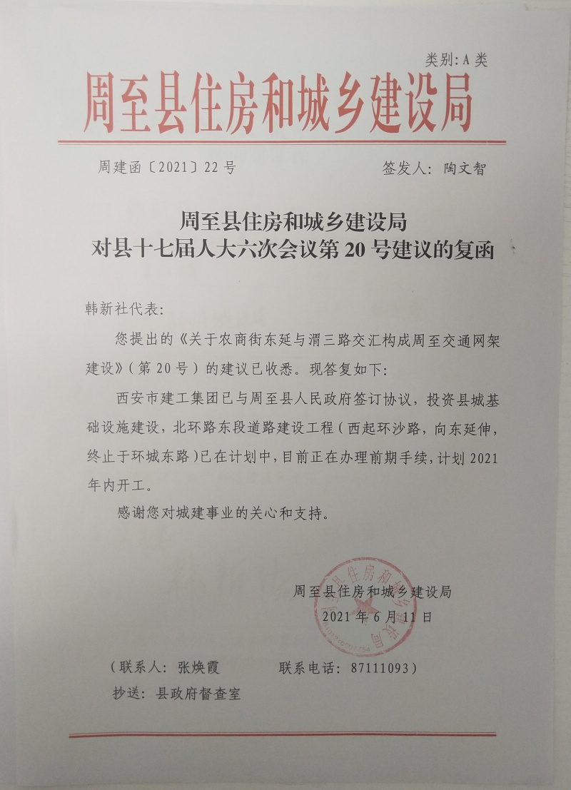 周至县住房和城乡建设局关于对县十七届人大六次会议第20号建议的复函
