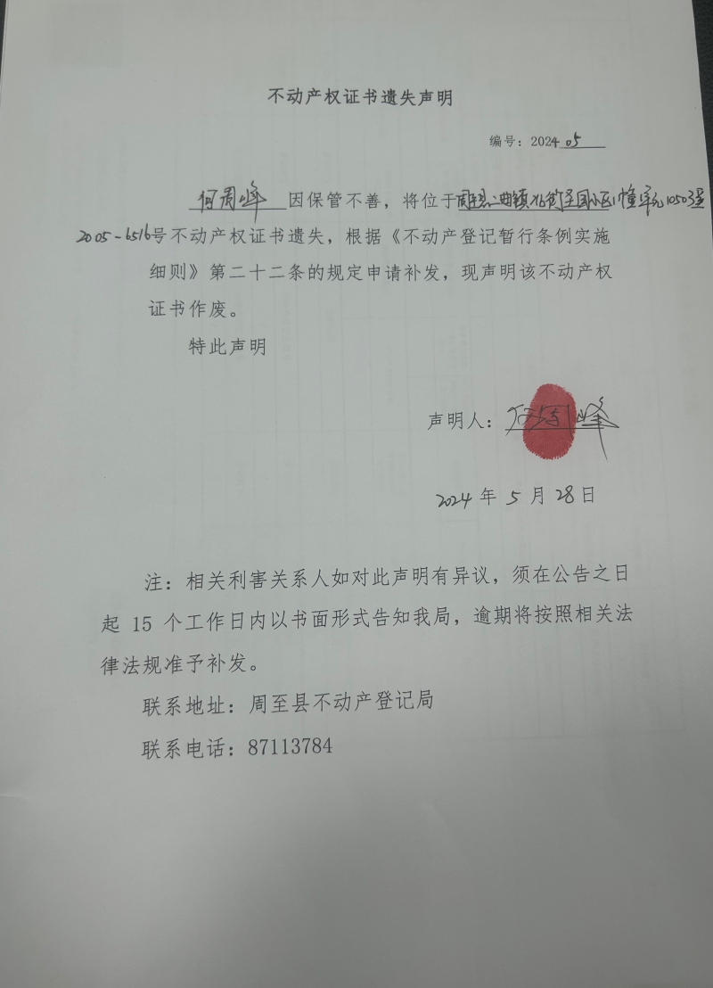 房屋所有权证遗失声明