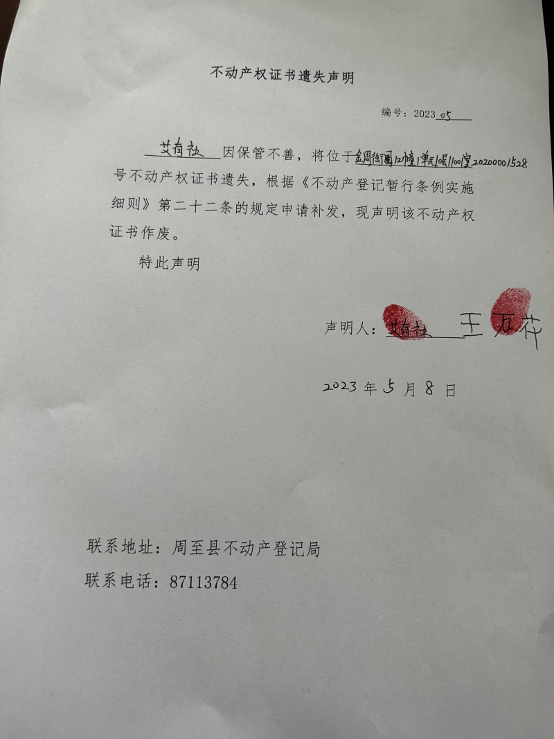 不动产权证书遗失声明
