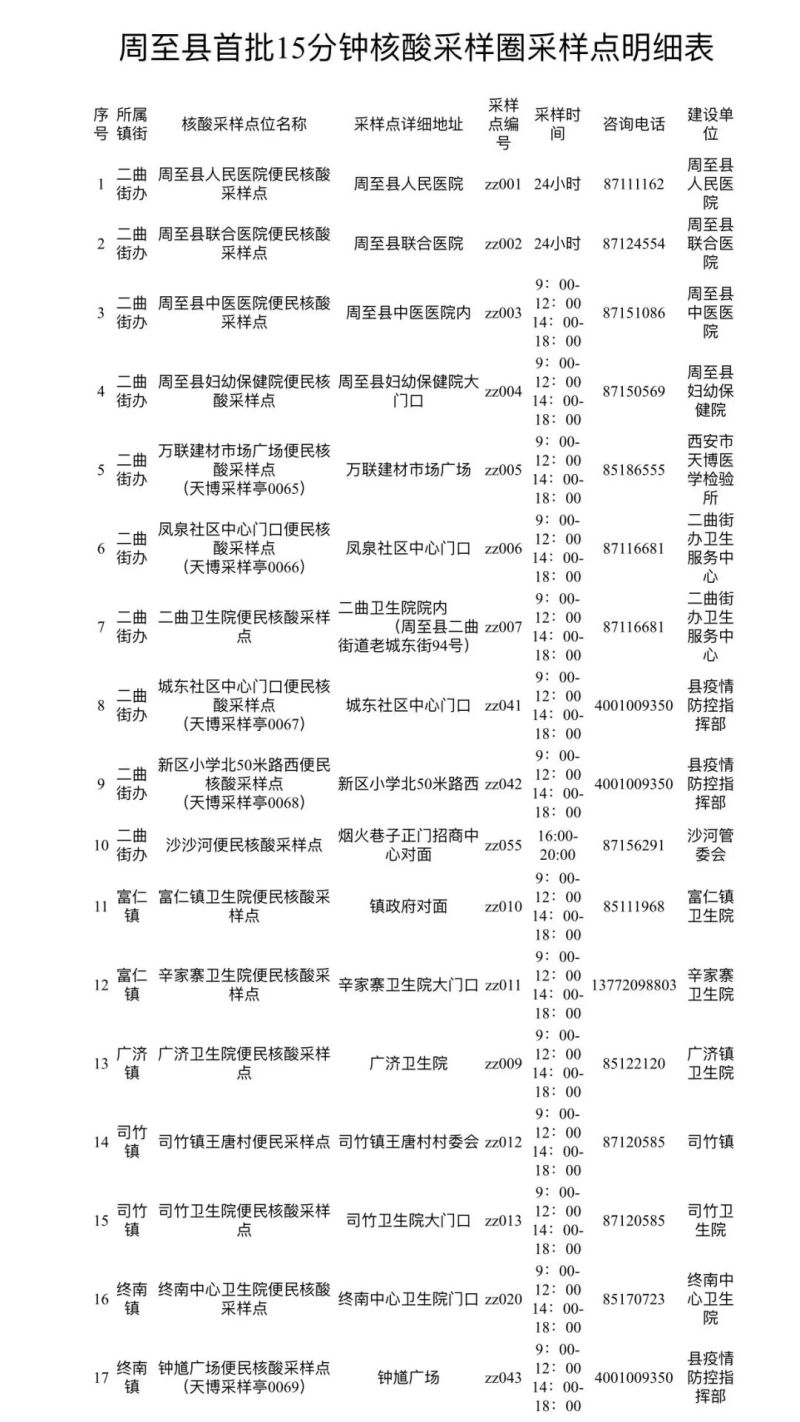 为了进一步发挥核酸检测在常态化疫情防控机制中的预警灵敏性,提升群众常态化核酸检测便捷性,满足广大群众“愿检尽检”需求,周至县对辖区内首批“15分钟”便民核酸采样点位进行更新,现向市民群众公示。市民群众可就近选择核酸检测采样点进行采样,请各位市民朋友在采样时做好个人防护,戴好口罩、不扎堆、不聚集、保持一米距离,遵守现场秩序,采样完成后尽快离开采样现场,不得聚集。县疫情防控指挥部将继续对采样点位进行动态调整,并在有关平台公示核酸采样点位调整情况,欢迎大家了解咨询。