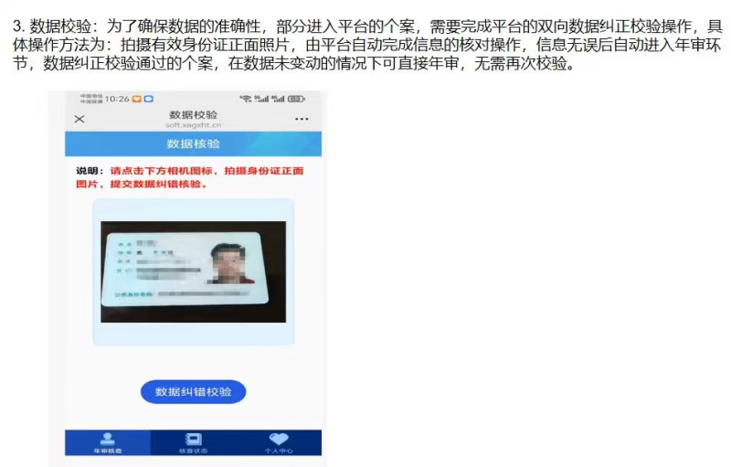 3. 数据校验:部分个案需拍摄有效身份证正面照片,由平台自动核对信息,校验通过且数据无变动的可直接进入年审,无需重复校验。