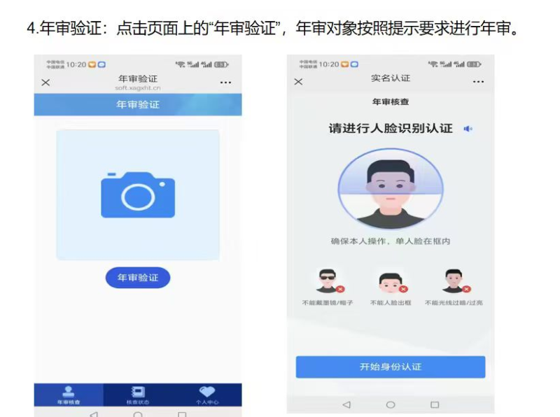 4. 年审验证:点击“年审验证”,按提示完成人脸识别认证(需本人操作,不可戴墨镜/帽子、人脸不可出框、避免光线过暗/过亮)。