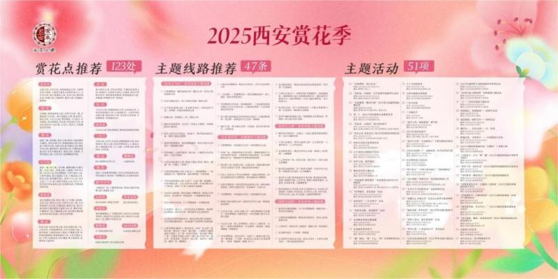 草木蔓发,春山可望。本次活动依托全市生态旅游资源,围绕“踏青”“赏花”“采摘”等主题,发布了2025西安赏花季赏花攻略,推出了123处赏花点、47条踏青赏花主题线路、51项主题活动,邀请市民游客沉浸式体验“长安春色入画来”的诗意浪漫。