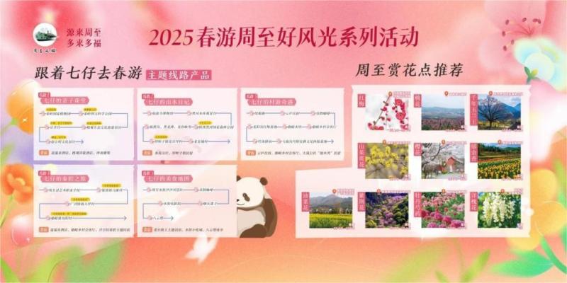 结合时下的“熊猫热”,“跟着七仔去春游”主题线路成为此次活动的亮点之一。周至联动熊猫七仔IP,串联全域农文商旅业态,推出“七仔的亲子课堂”“七仔的山水日记”“七仔的村游奇遇”“七仔的秦腔之旅”“七仔的美食地图”等5条春游周至主题线路产品。