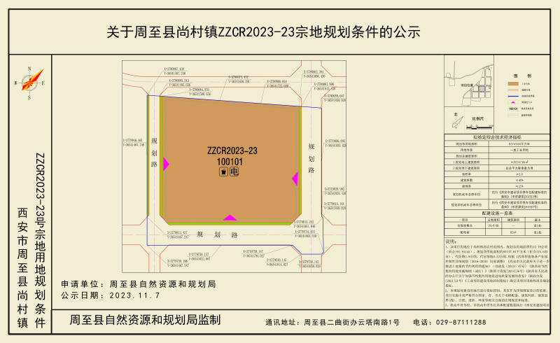 该项目用地位于尚村镇西岩村范围内,用地性质为一类工业用地(100101),规划净用地面积约83747.84平方米(折合125.622亩),地上总建筑面积≥83747.84㎡;规划指标具体如下:容积率≥1.0;建筑系数≥40%;绿地率≤15%;行政办公及生活服务设施用地所占比例≤7.0%,行政办公及生活服务设施建筑面积所占比例≤15.0%。地下人防建筑面积最终以相关部门的审批为准,建筑退让距离按《西安市城乡规划管理技术规定》执行。城市设计要求、交通组织规划要求、配套设施规划要求等按照相关方面的法规规范执行。规划机动车停车位及非机动车停车位按照《西安市建设项目停车位配建标准的通知》(市资源发〔2023〕3号)执行,机动车、非机动车停车位个数及面积以最终建筑工程审批内容为准。项目实施中须严格符合国家、省、市关于电梯配备、建筑间距、日照、消防、环保等相关方面的法规规范和标准。建设项目需满足海绵城市建设要求。