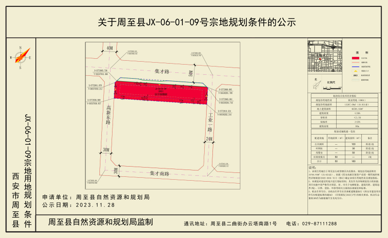 该项目用地位于周至县行政管辖区内范围内,用地性质为商业用地(0901),规划净用地面积约13287.09平方米,地上总建筑面积≥46504.82平方米;规划指标具体如下:容积率≤3.5;建筑密度≤50%;绿地率≥25%,建筑高度≤80m。地下人防建筑面积最终以相关部门的审批为准,建筑退让距离按《西安市城乡规划管理技术规定》执行。城市设计要求、交通组织规划要求、配套设施规划要求等按照相关方面的法规规范执行。规划机动车停车位及非机动车停车位按照《西安市建设项目停车位配建标准的通知》(市资源发〔2023〕号)执行,机动车、非机动车停车位个数及面积以最终建筑工程审批内容为准。项目实施中须严格符合国家、省、市关于电梯配备、建筑间距、日照、消防、环保等相关方面的法规规范和标准。建设项目需满足海绵城市建设要求。