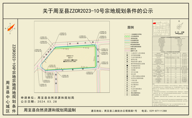 ZZCR2023-10宗地位于周至县中心城区西北角,石桥路以西,环城北路以南。规划总用地面积为81506.65平方米,其中净用地面积为69806.32平方米,代征道路面积4246.09平方米,代征绿地面积7454.24平方米,规划净用地性质为二类城镇住宅用地(070102),容积率2.0(建设方案应符合土地集约节约利用要求,宗地容积率指标按照上限控制),建筑密度≤20.0%,绿地率≥35.0%,建筑限高54米。停车位配建按照《西安市建设项目停车位配建标准的通知》(市资源发〔2023〕3号)执行。