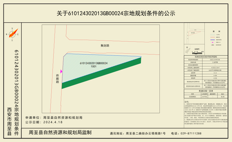 610124302013GB00024宗地位于西安高新区集贤产业园,集财路以南、终殿路以东。规划净用地面积为20221.54㎡,规划净用地性质为工业用地(1001),容积率≥1.0,建筑系数≥40%,绿地率≤15%。停车位配建按照《西安市建设项目停车位配建标准的通知》(市资源发〔2023〕3号)执行。