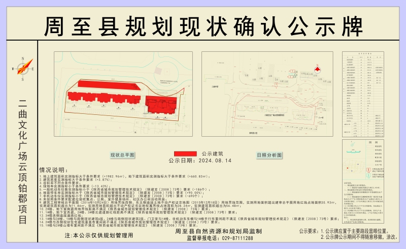 二曲文化广场云顶铂郡项目位于二曲街办淳风路中段,建设单位为陕西铂金城置业有限公司。按照周至县处理房屋办证遗留问题领导小组办公室要求,现将规划现状确认内容公示如下: