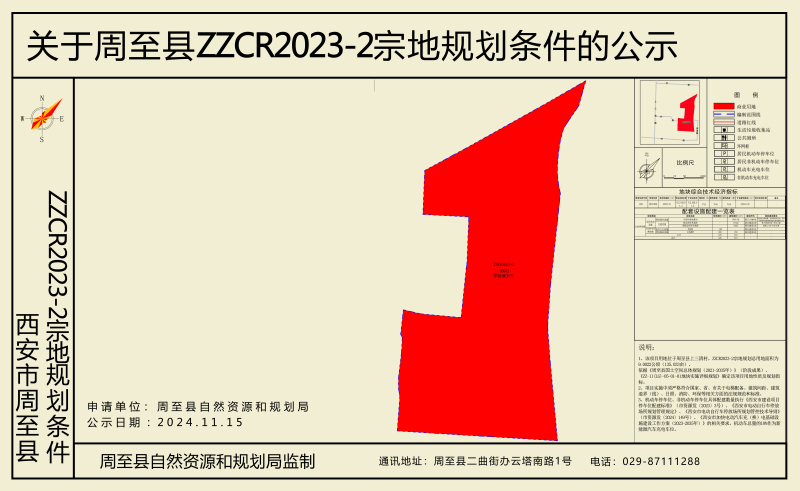 ZZCR2023-2宗地位于西安市周至县行政管辖区内,楼观镇上三清村范围内。规划净用地面积90022.03㎡,用地性质为商业用地(0901),地上建筑面积≤180044.06㎡,容积率≤2.0且≥1.2,建筑密度≤50%,绿地率≥25%,建筑限高50m。停车位配建标准按照《西安市建设项目停车位配建标准》(市资源发〔2023〕3号)文件要求执行。配建设施如下:公共厕所附设3处,占地面积300㎡,建筑面积150㎡;生活垃圾收集点独立占地6处,建筑面积60㎡;环网柜独立占地2处,占地面积126㎡。