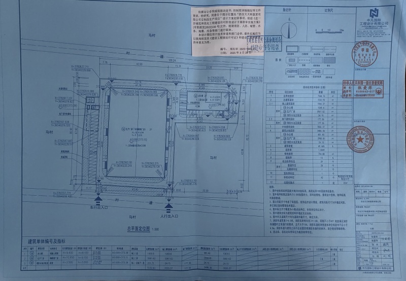 西安天天鲜蔬菜有限公司豆制品生产项目建设地点位于周至县尚村镇马村南三街东段。该项目用地面积7048.76平方米(10.573亩),已取得不动产权证(陕(2024)周至县不动产权第0006585号);用途为工业用地。项目总建筑面积7232.93平方米(地上7055.37平方米,地下177.56平方米),计容面积7055.37平方米(容积率1.0009≥1.0),建筑系数49.46%≥40%,绿地面积704.88平方米(绿地率10%≤15%),行政办公及生活服务设施用地面积481.40平方米(6.83%≤7%),行政办公及生活服务设施建筑面积1069.60平方米(14.79%≤15%);机动车停车位29辆,非机动车停车位42辆。本次报建内容:1#办公楼1069.6平方米,2#生产厂房5961.62平方米,3#消防水池及泵房201.71平方米(地上24.15平方米,地下177.56平方米)。