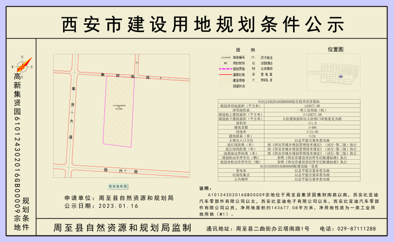 该宗地位于周至县集贤产业园集财南路以南,西安比亚迪汽车零部件有限公司以北,西安比亚迪电子有限公司以东,西安比亚迪汽车零部件有限公司以西。本次规划净用地面积为143677.08㎡,规划净用地性质为一类工业用地,地上总建筑面积≥143677.08㎡,容积率≥1.0,建筑系数≥40.0%,绿地率≤15.0%,行政办公及生活服务设施用地所占比例≤7.0%,行政办公及生活服务设施建筑面积所占比例≤15.0%。