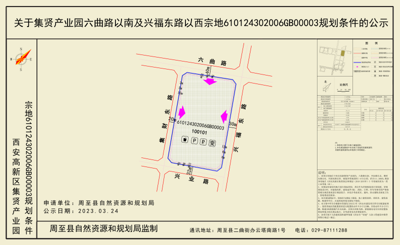 该宗用地位于西安高新集贤产业园内,六曲路以南、兴业路以北、集财东路以东、兴福东路以西。规划净用地面积7.4173公顷,折合111.260亩,规划指标具体如下:容积率≥1.0,建筑密度≥40%,绿化率≤15%,行政办公及生活服务设施用地所占比例≤7.0%,行政办公及生活服务设施建筑面积所占比例≤15.0%。机动车停车位约223个、非机动车停车位约371个[具体配建数量执行《西安市建设项目停车位配建标准的通知》 (市资源发〔2023〕3号)的相关要求],机动车总量的30%作为新能源汽车充电车位。