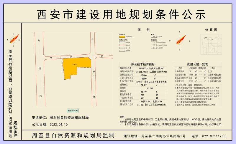 该宗用地位于周至县石桥路以西、万景路以南,规划净用地21315.05平方米(以最终供地为准),用地性质为公共卫生用地(080603),容积率0.788,建筑密度24.87%,绿地率35.19%,机动车位236辆,地上建筑面积16800平方米,地下建筑面积8300平方米(最终以总平方案审查为准)。地下建筑面积包含物资储存用房、疫苗冷链库、设备及人防等面积,最终停车位数及地下停车建筑面积根据报建方案的建筑功能分类的对应标准具体核算,地下人防建筑面积以相关部门审批为准,地下总建筑面积以最终报建审查为准。