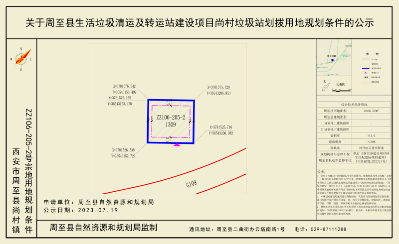 该项目用地位于尚村镇临川寺村范围内,用地性质为环卫用地(1309),规划净用地面积2668.52平方米。规划指标具体如下:容积率≤1.0,建筑密度≤30.0%,绿地率需符合相关技术要求,地下人防建筑面积最终以相关部门的审批为准,建筑退让距离按《西安市城乡规划管理技术规定》执行。城市设计要求、交通组织规划要求、配套设施规划要求等按照相关方面的法规规范执行。规划机动车停车位及非机动车停车位按照《西安市建设项目停车位配建标准的通知》(市资源发〔2023〕3号)执行,机动车、非机动车停车位个数及面积以最终建筑工程审批内容为准。项目实施中须严格符合国家、省、市关于电梯配备、建筑间距、日照、消防、环保等相关方面的法规规范和标准。建设项目需满足海绵城市建设要求。