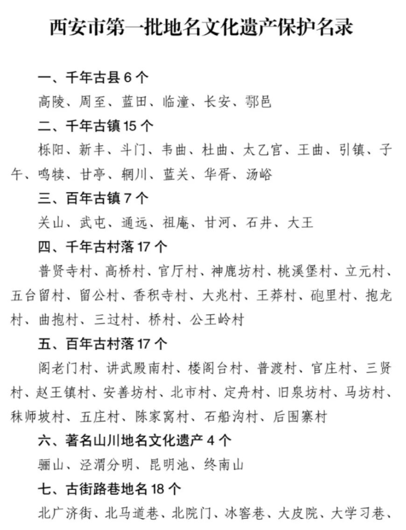 此次全市首批发布的97个地名文化遗产保护名录,是从621个区级地名文化遗产保护名录中,经过实地踏勘、普查登记、查阅史料、调研评估、逐级申报、专家评审、部门会商等多个环节择优认定,涉及古县、古镇、古村、道路街巷、红色地名、著名自然地理实体及历史地名等多个大类。其中,不仅有周至、高陵等千年古县名称,还有冰窖巷、贡院门等反映城市特色历史文化的道路街巷名称,也有大白杨村等,经过城市发展已消失,但仍在日常交往中常被提及的传统村落名称等。