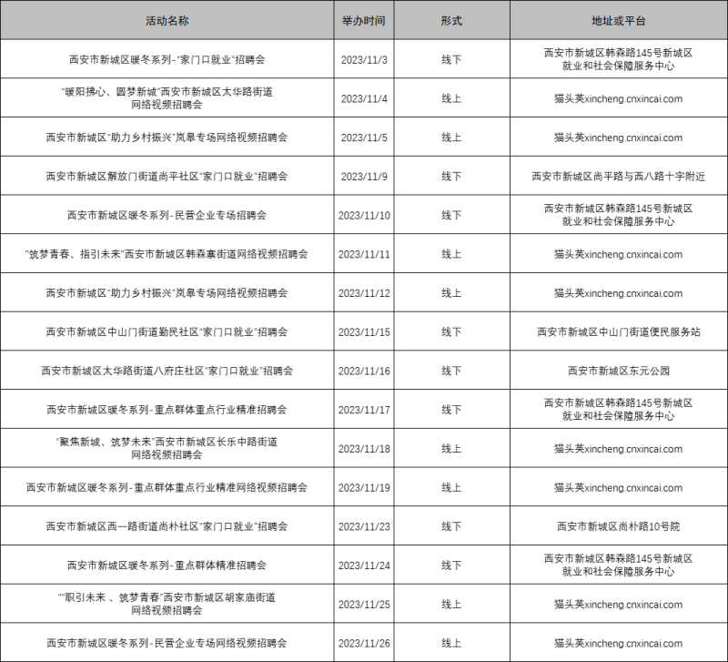 为助力高校毕业生等重点群体就业,西安市及部分区县11月份开展多场线上线下招聘会机会多多!找工作的小伙伴千万不要错过!具体安排如下