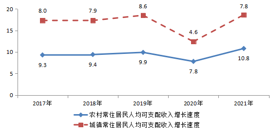 图6 2017——2021年城乡居民人均可支配收入增长速度(%)