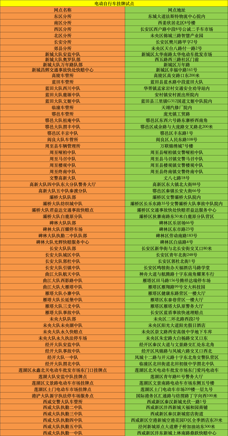 目前,电动自行车车主可通过在“西安交警”微信公众号“业务办理”中的“电动自行车业务预约”功能,选择就近车管所分所、交警大队现场挂牌点办理电动自行车预约挂牌,在挂牌点由交警部门工作人员核验车主身份证、车辆合格证、购车发票(委托代理的还需提交车主书面委托及代理人身份证),查验电动自行车,符合规定的,车主缴纳号牌工本费后(6元),交警部门予以核发电动自行车号牌及电子行驶证。(具体点位附后)