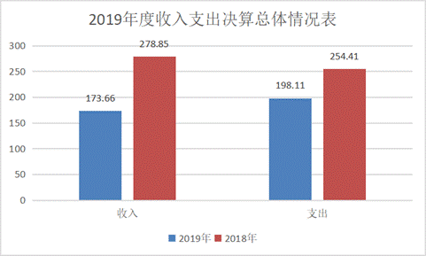 (一)2019年度全年收入总计173.66万元,其中,本年收入173.66万元,较上年减少105.19万元,下降60.57%,主要原因是项目减少人员经费减少;用事业基金弥补收支差额0万元;年初结转和结余资金24.45万元,较上年增加24.45万元,增长100%,主要原因项目资金剩余。