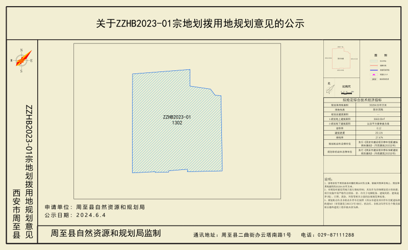 ZZHB2023-01宗地位于周至县尚村镇圪塔头村东北角、耿峪河西岸空地上。规划净用地面积为30284.09㎡,规划净用地性质为排水用地,容积率0.12,建筑密度20.11%,绿地率27.47%。停车位配建按照《西安市建设项目停车位配建标准的通知》(市资源发〔2023〕3号)执行。